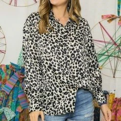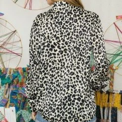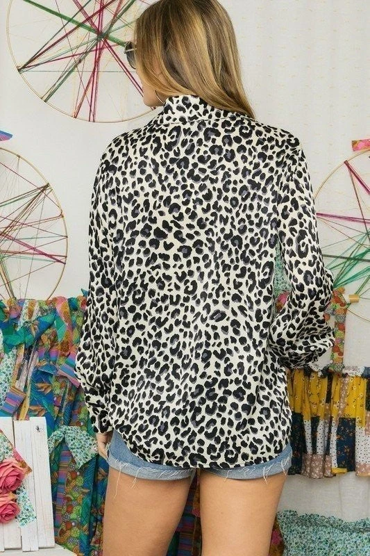 Super cute black and cream colored leopard print button up top. Wear this top with jeans for a more casual look or dress it up with a nice black pencil skirt.
