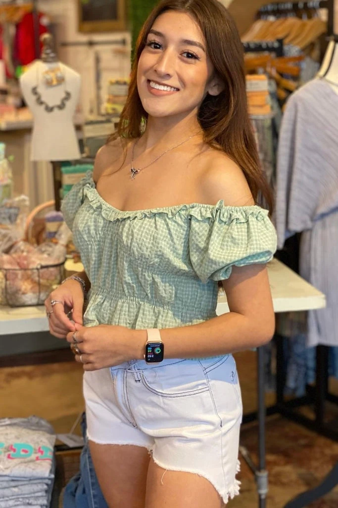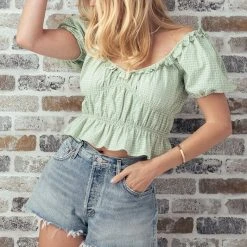 This sage checkered tiered ruffle cropped top is perfect for a fun picnic date! Style this top with our “Lilian” shorts for a fun summer outfit!