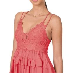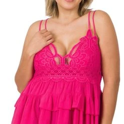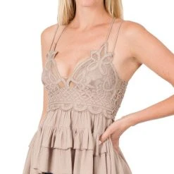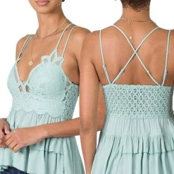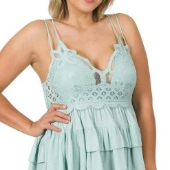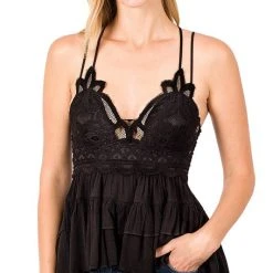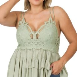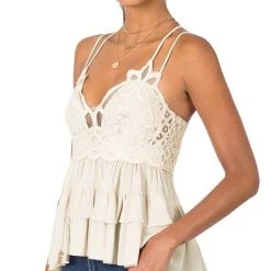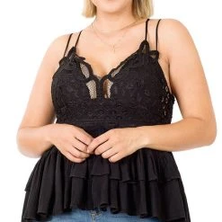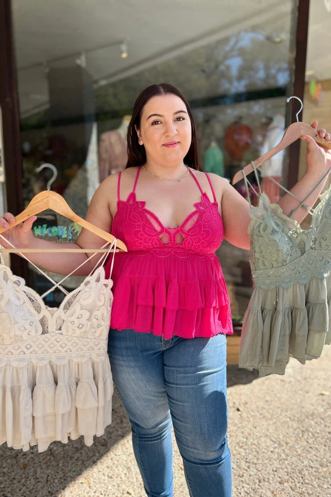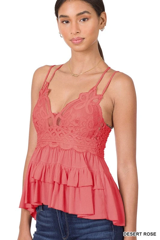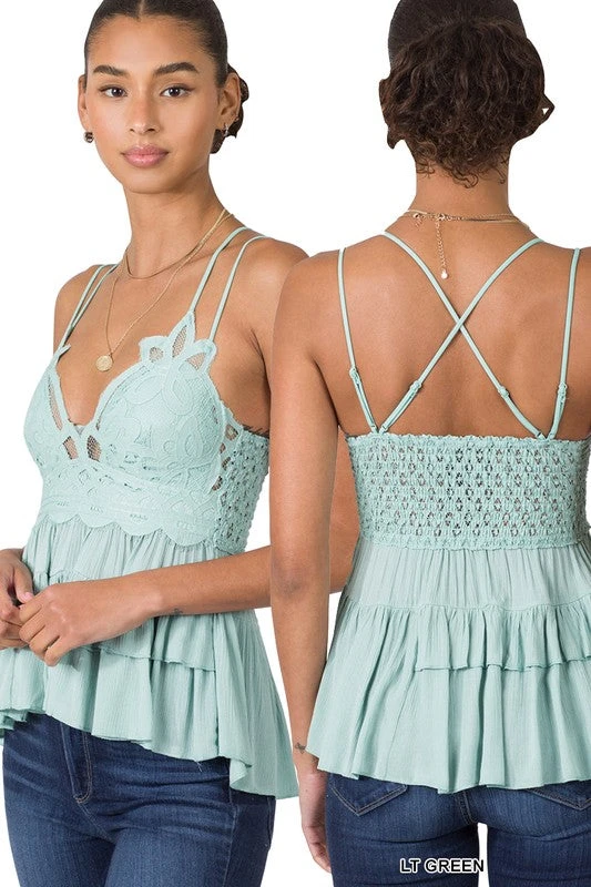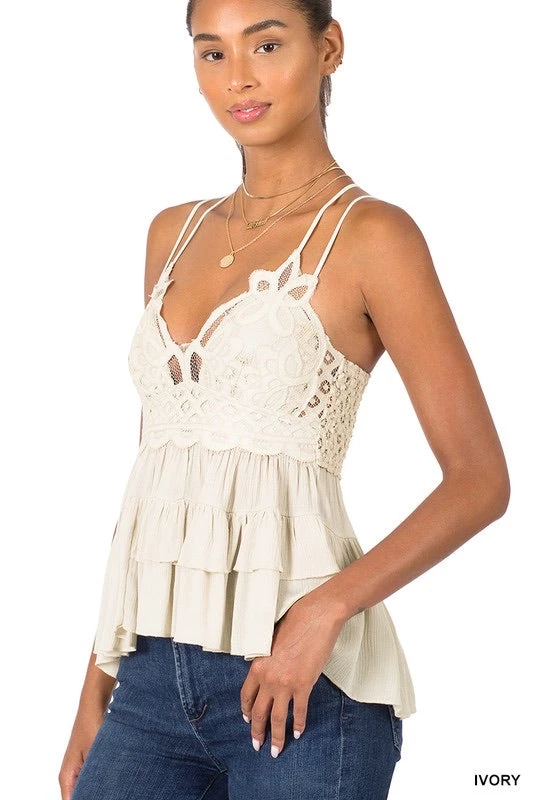 Super cute crochet lace peplum cami with tiered ruffled peplum hem.