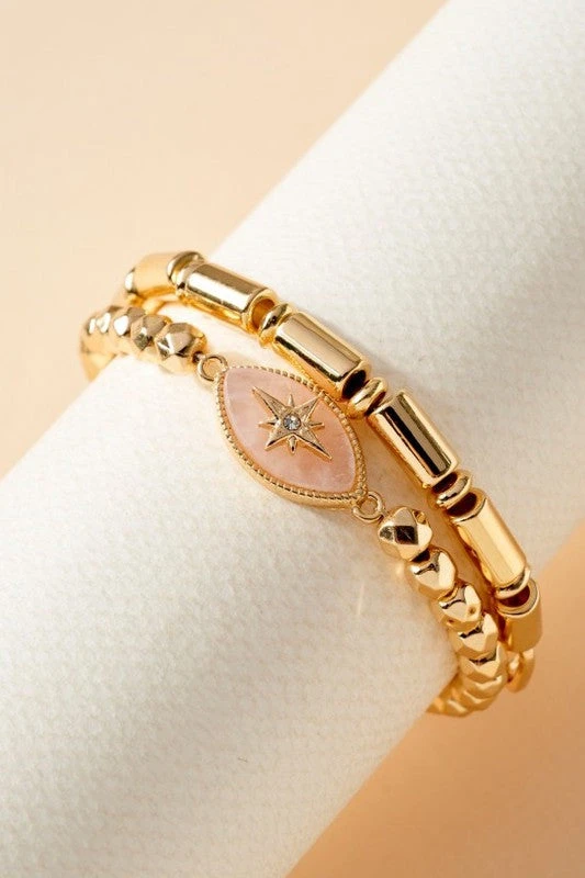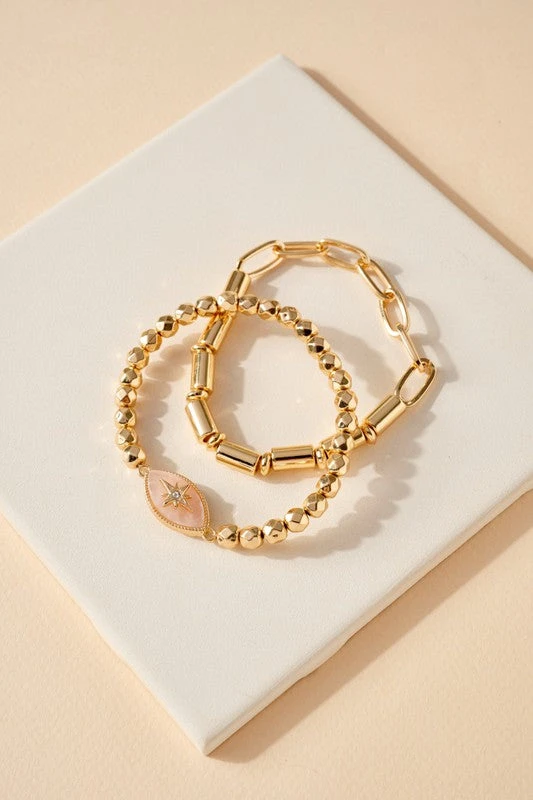CCB ball beaded stretch chain layered bracelets with Stella accent rose gold oval shaped stone charm.